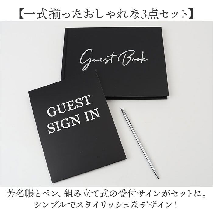 ・芳名帳とペン、組み立て式の受付サインがセットに。シンプルでスタイリッシュなデザイン!