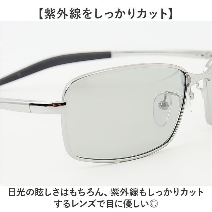 ・調光機能付きで紫外線の量によって自動でレンズカラーの濃淡が自動で変わる。※