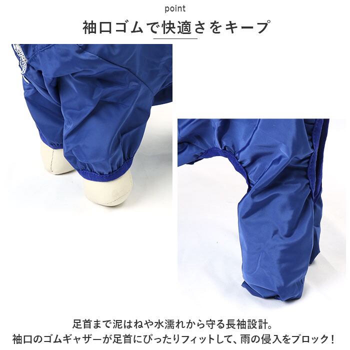 ・毛足の長い小型犬や活発な中型犬も、お外が雨の日はお腹や脚周りが泥で汚れてしまいがち。お散歩が大好きなワンちゃんのために設計されたすっぽりと着られるドッグ用レインウェア。