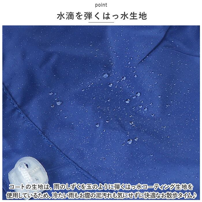 ・コートの生地は、雨のしずくを玉のように弾くはっ水コーティング生地を使用しているため、冷たい雨もお腹の泥汚れも気にせずに快適なお散歩タイム♪
