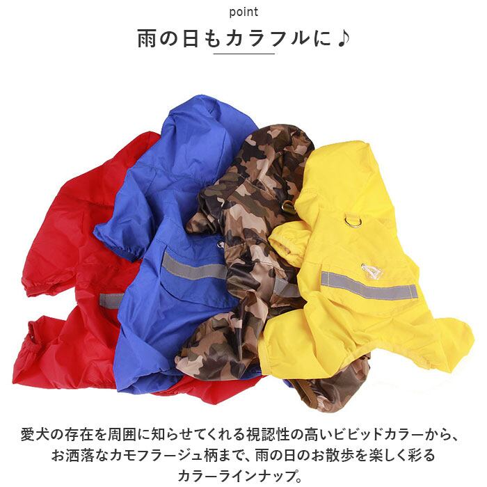 ・愛犬の存在を周囲に知らせてくれる視認性の高いビビッドカラーから、お洒落なカモフラージュ柄まで、雨の日のお散歩を楽しく彩るカラーラインナップ。