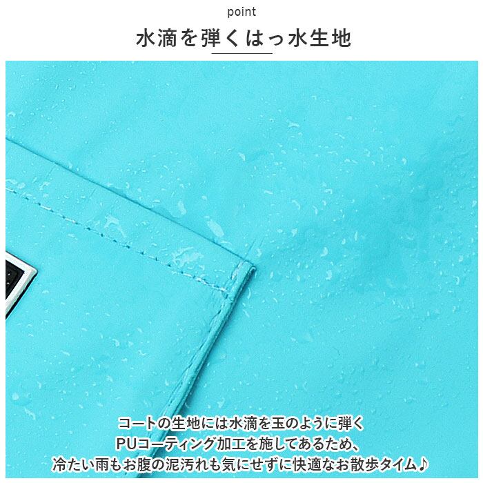 ・コートの生地には水滴を玉のように弾くPUコーティング加工を施してあるため、冷たい雨もお腹の泥汚れも気にせずに快適なお散歩タイム♪