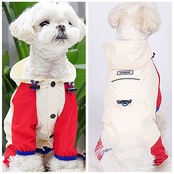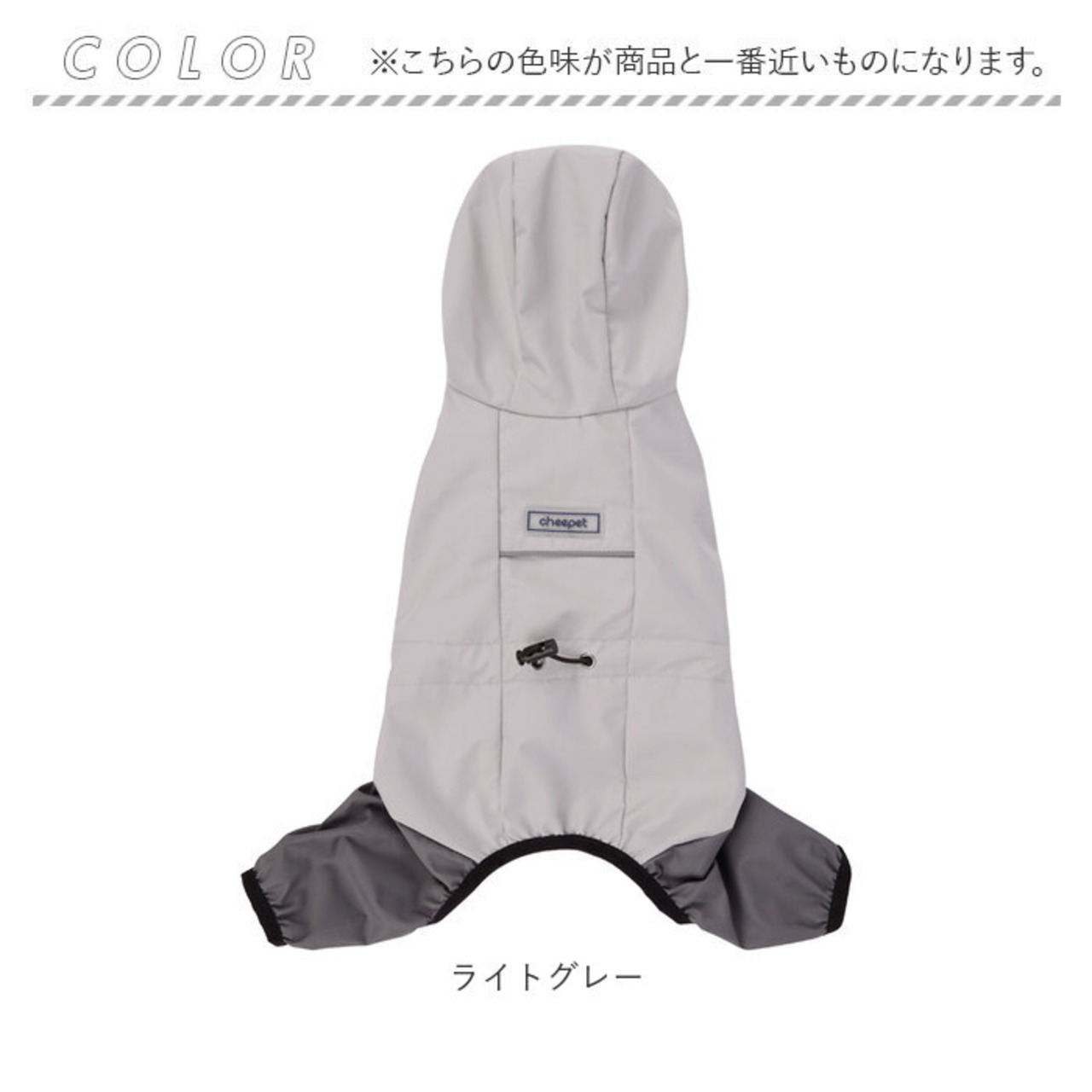 ・すっぽりと被れるフード付きのデザイン。フチのドローコードをキュッと絞って、吹き付ける雨風からワンちゃんの頭をガード!