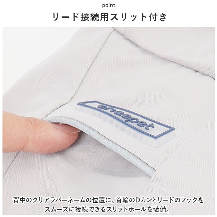 ・背中のクリアラバーネームの位置に、首輪のDカンとリードのフックをスムーズに接続できるスリットホールを装備。