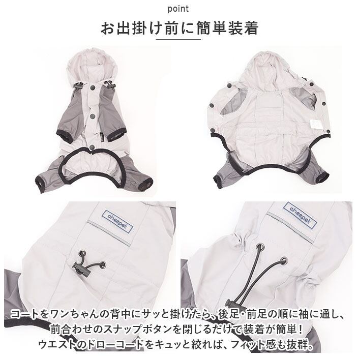 ・コートをワンちゃんの背中にサッと掛けたら、後足・前足の順に袖に通し、前合わせのスナップボタンを閉じるだけで装着が簡単!ウエストのドローコードをキュッと絞れば、フィット感も抜群。