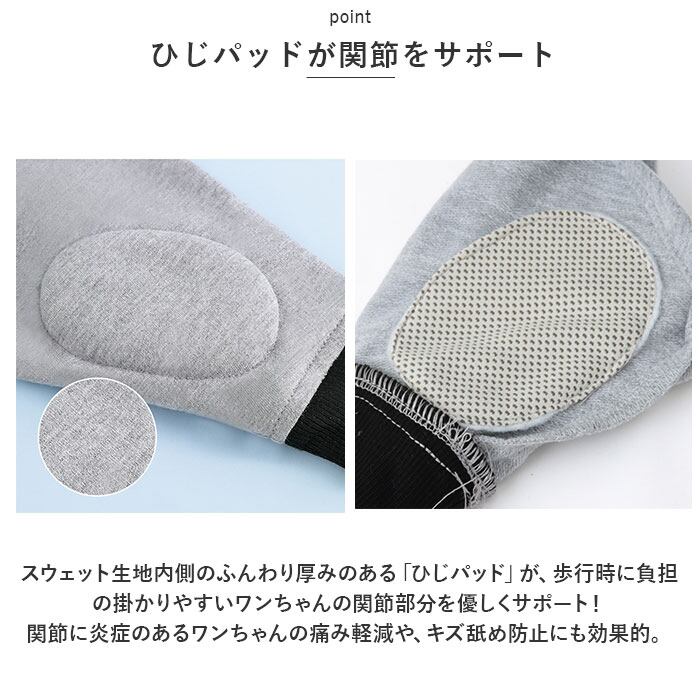 ・スウェット生地内側のふんわり厚みのある「ひじパッド」が、歩行時に負担の掛かりやすいワンちゃんの関節部分を優しくサポート!関節に炎症のあるワンちゃんの痛み軽減や、キズ舐め防止にも効果的。