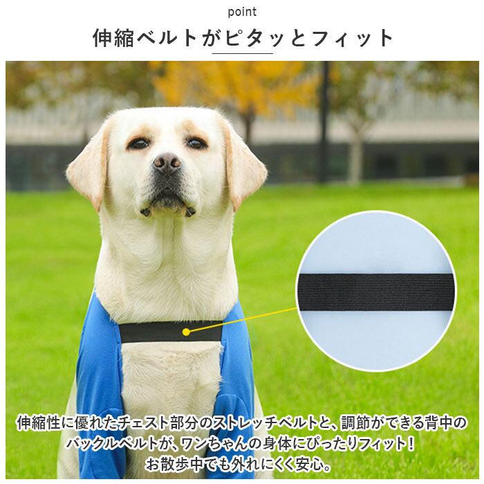 ・伸縮性に優れたチェスト部分のストレッチベルトと、調節ができる背中のバックルベルトが、ワンちゃんの身体にぴったりフィット!お散歩中でも外れにくく安心。