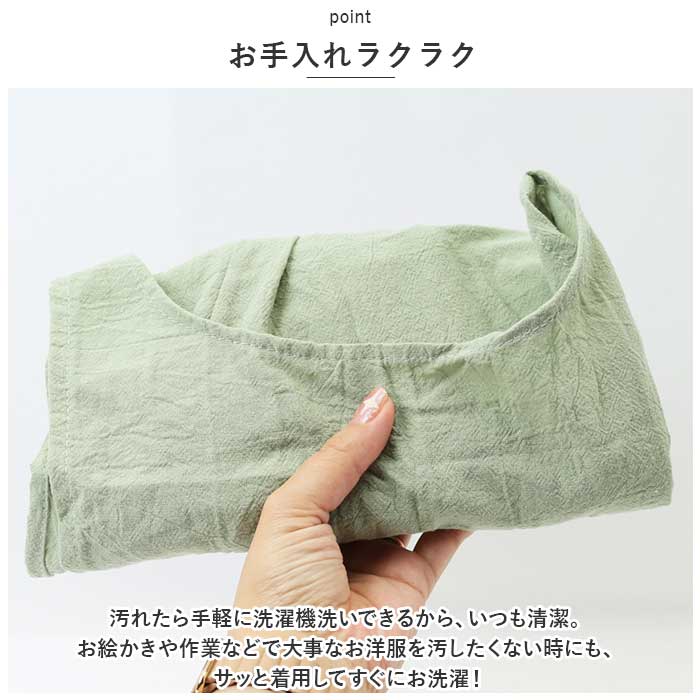 ・汚れたら手軽に洗濯機洗いできるから、いつも清潔。お絵かきや作業などで大事なお洋服を汚したくない時にも、サッと着用してすぐにお洗濯!