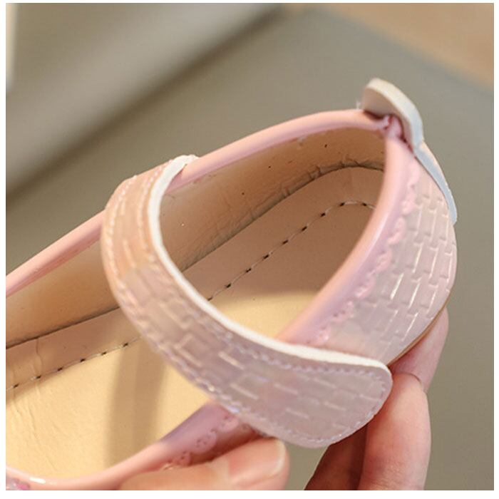 ・光沢のあるPU素材を使用。つま先部分にハート型のカラフルなクリアビーズで作られた、立体的なモチーフを配置。キラッと光るストーンもプラス。