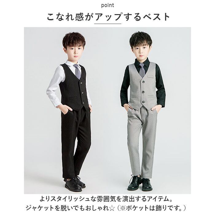・ジャケット、ベスト、ロングパンツ、ネクタイの4点セット。大人顔負けのかっこいいスタイリングが完成☆