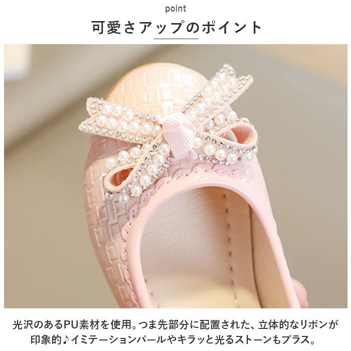 ・光沢のあるPU素材を使用。つま先部分に配置された、立体的なリボンが印象的♪イミテーションパールやキラッと光るストーンもプラス。