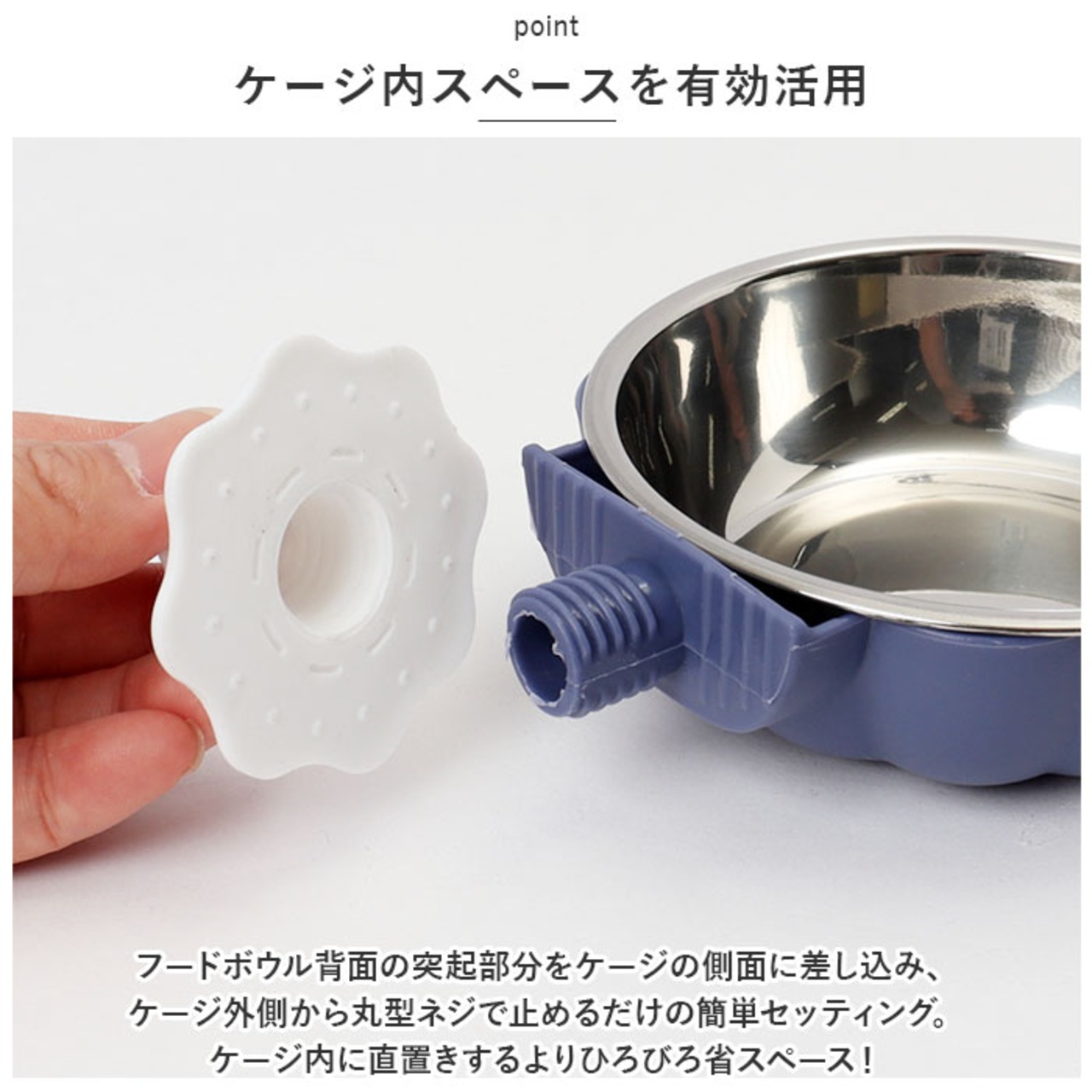・フードボウル背面の突起部分をケージの側面に差し込み、ケージ外側から丸型ネジで止めるだけの簡単セッティング。ケージ内に直置きするよりひろびろ省スペース!