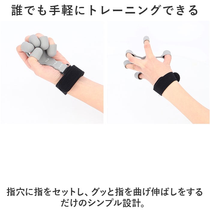 ・指穴に指をセットし、グッと指を曲げ伸ばしをするだけのシンプル設計。簡単でお手軽なので、誰でもどこでもトレーニングができる☆