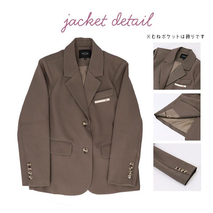 ・フロントボタンが1列に並んだ、スタンダードデザイン。ソフトな肩パッド入りで、美しいシルエットをキープ。左右にはポケットを配置し、胸元のタグがアクセント。(※胸ポケットは飾りです。)