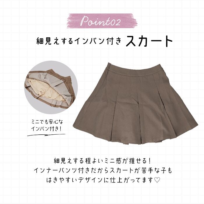 ・ジャケットには裏地が付いており、滑りが良く着脱がスムーズ。スカートにはインナーパンツ付きで安心。