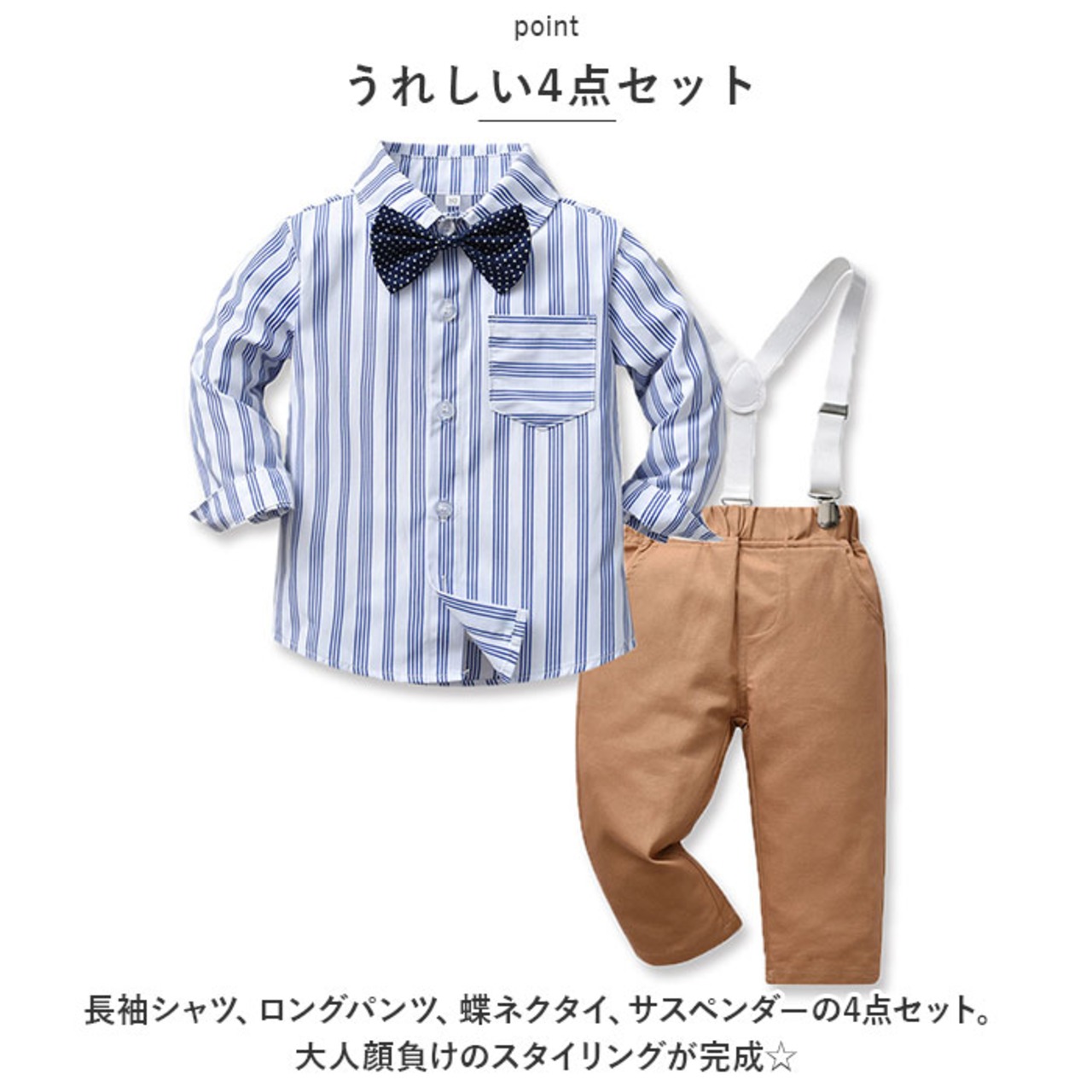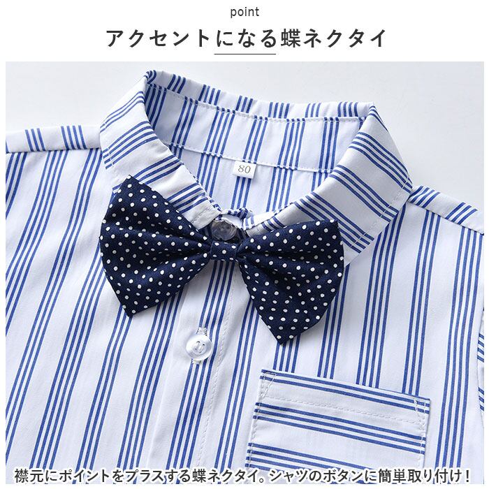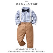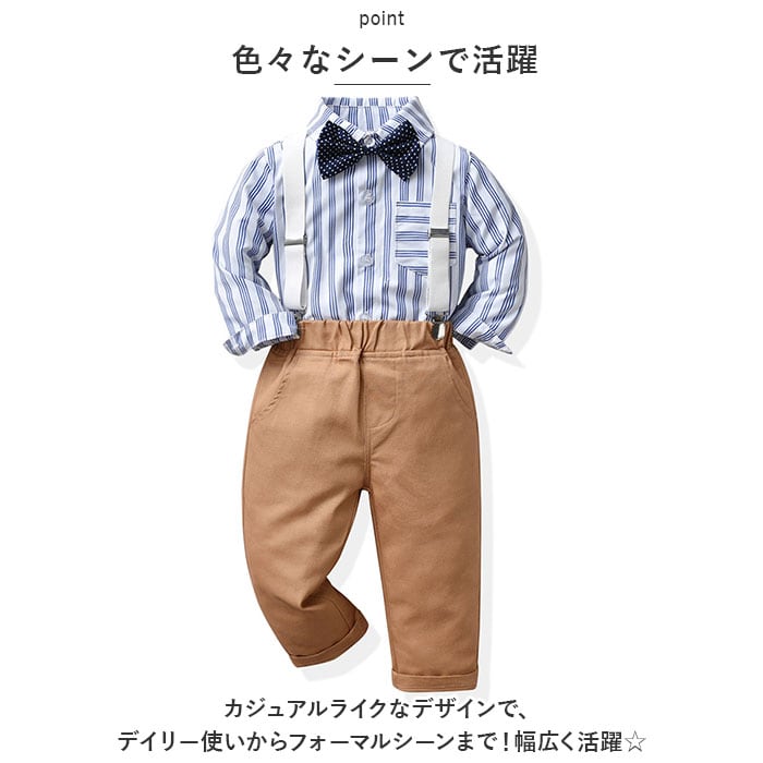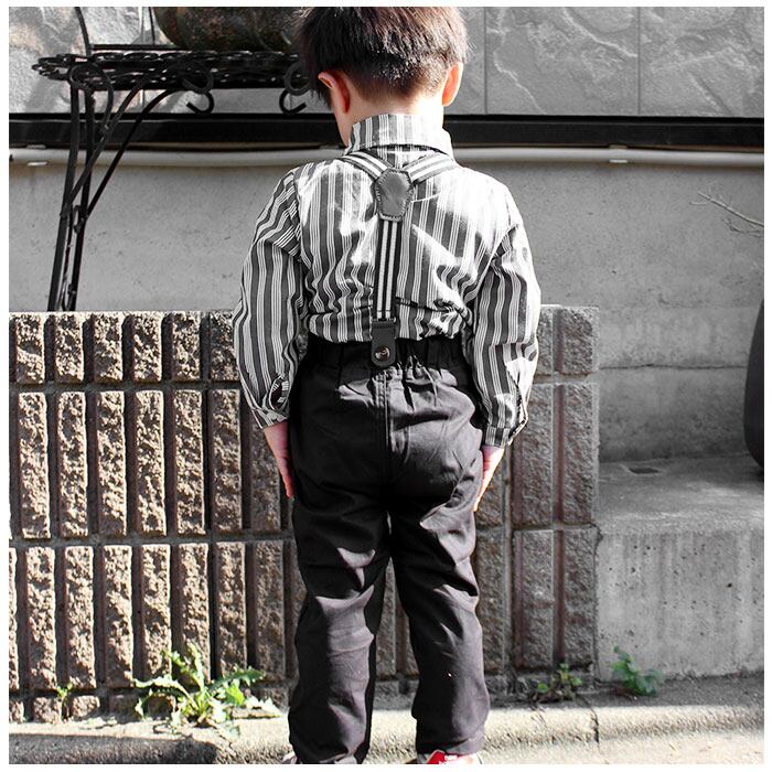 ・長袖シャツ、ロングパンツ、蝶ネクタイ、サスペンダーの4点セット。大人顔負けのスタイリングが完成☆