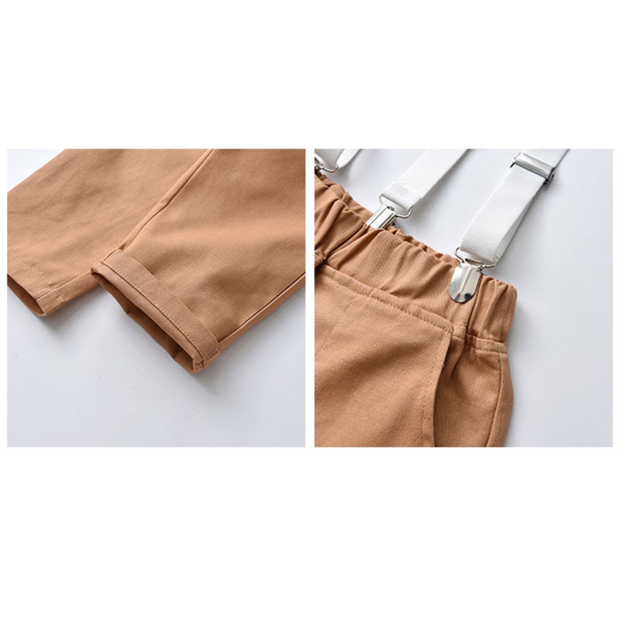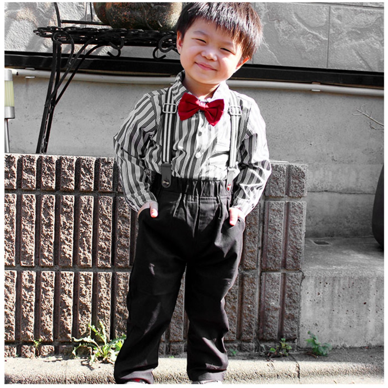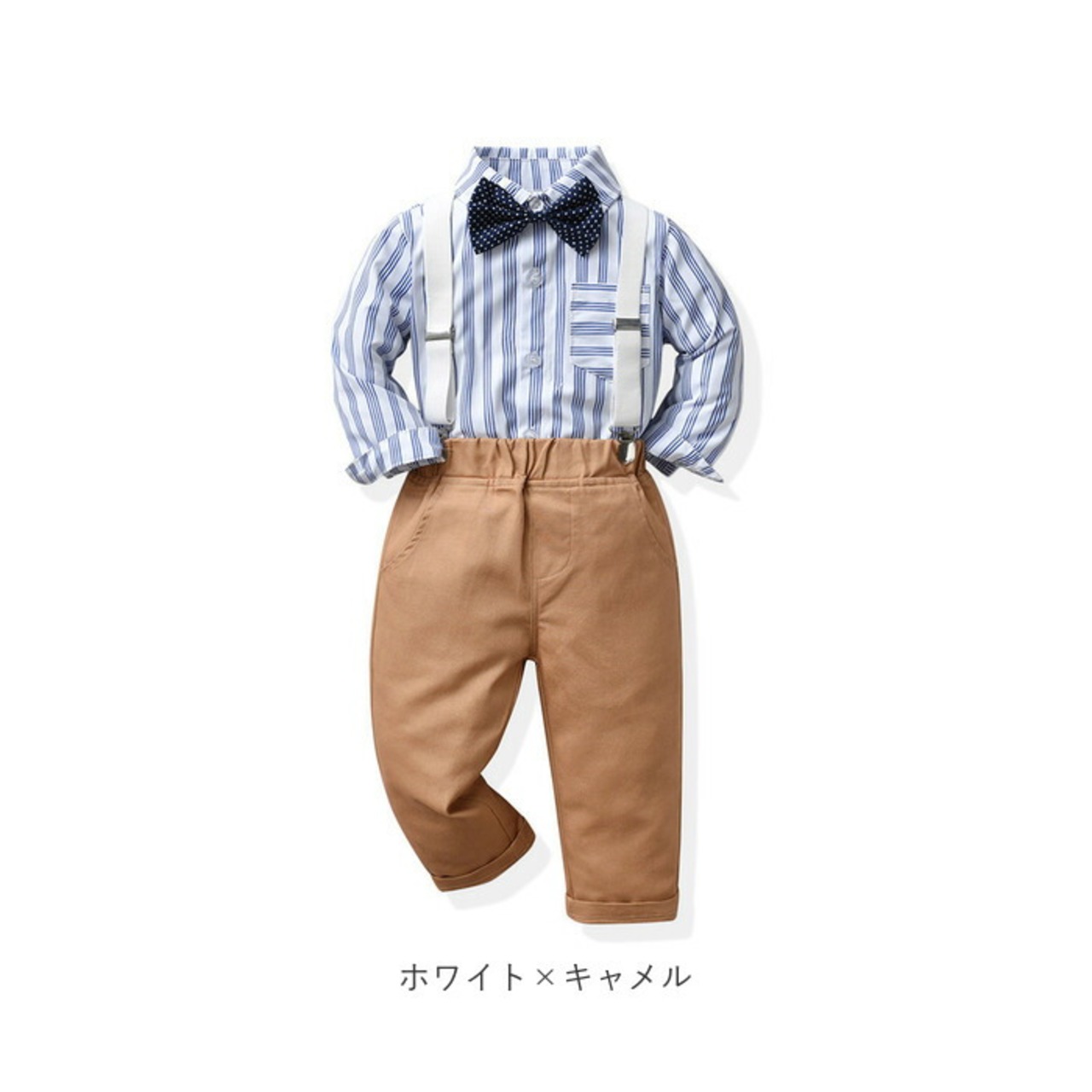 ・長袖シャツ、ロングパンツ、蝶ネクタイ、サスペンダーの4点セット。大人顔負けのスタイリングが完成☆