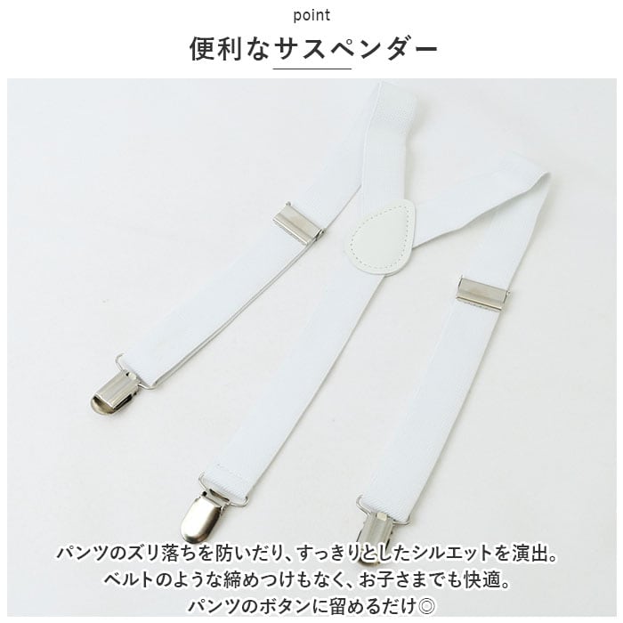 ・パンツのズリ落ちを防いだり、すっきりとしたシルエットを演出。ベルトのような締めつけもなく、お子さまでも快適。パンツのボタンに留めるだけ◎