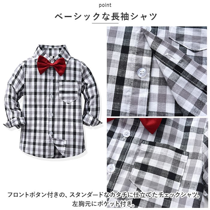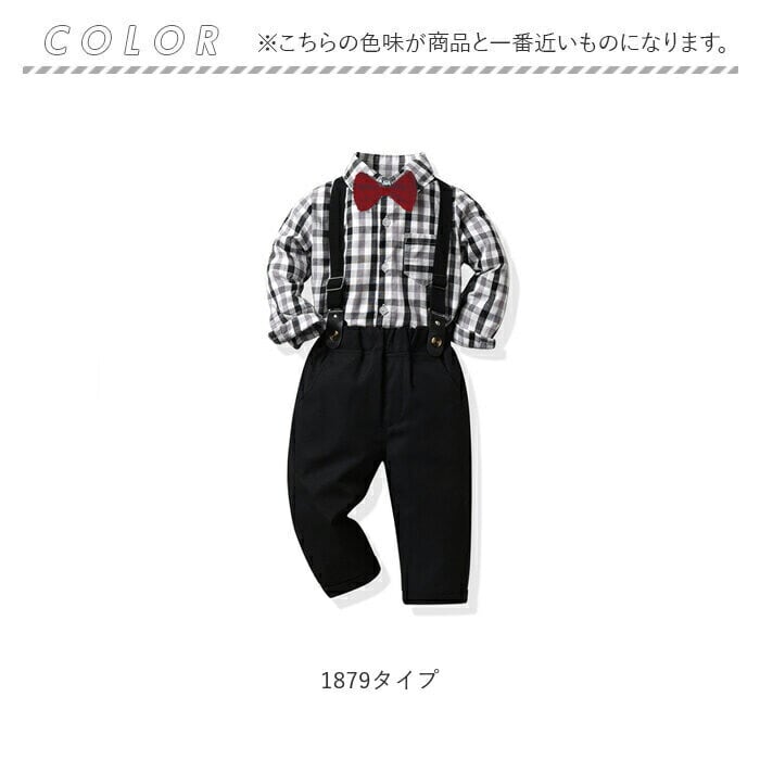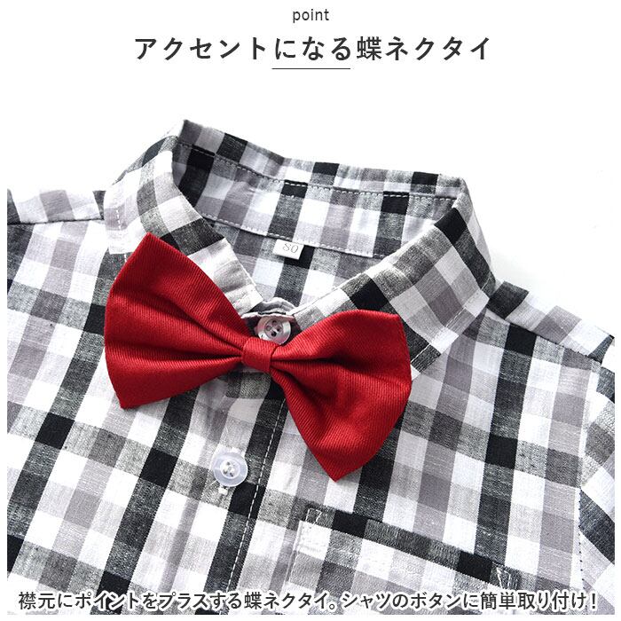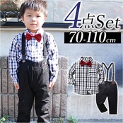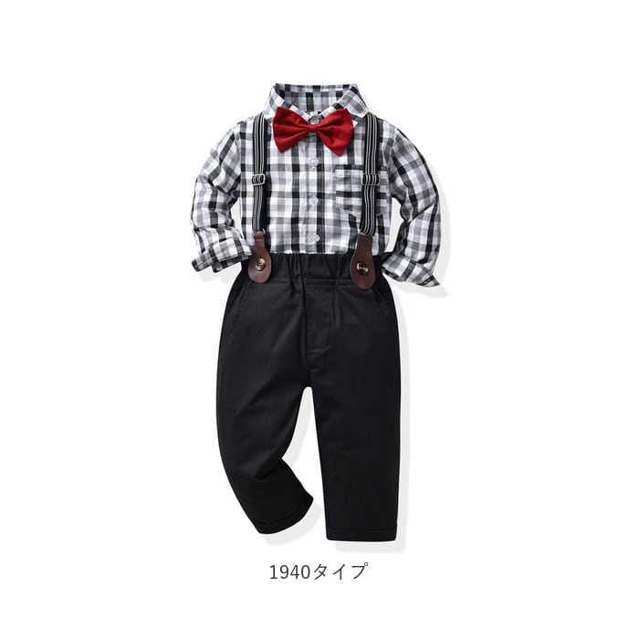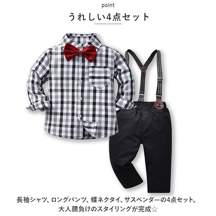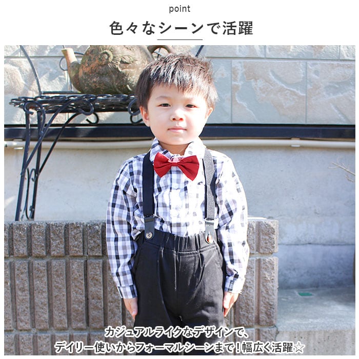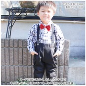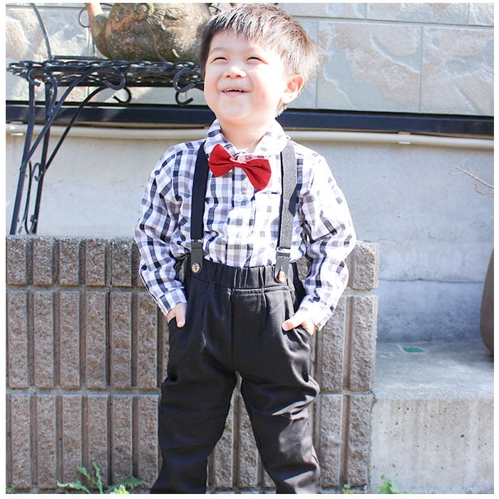 ・長袖シャツ、ロングパンツ、蝶ネクタイ、サスペンダーの4点セット。大人顔負けのスタイリングが完成☆