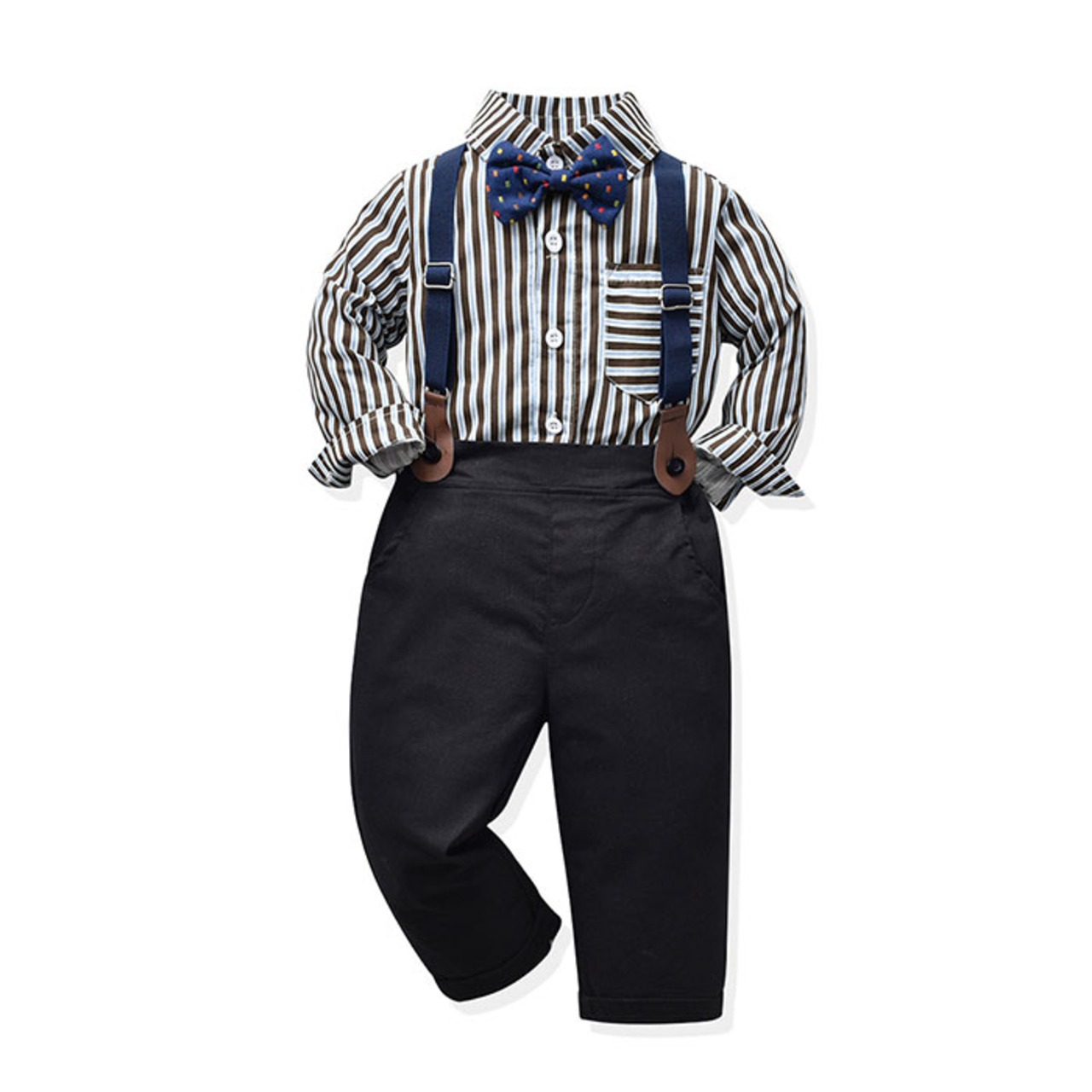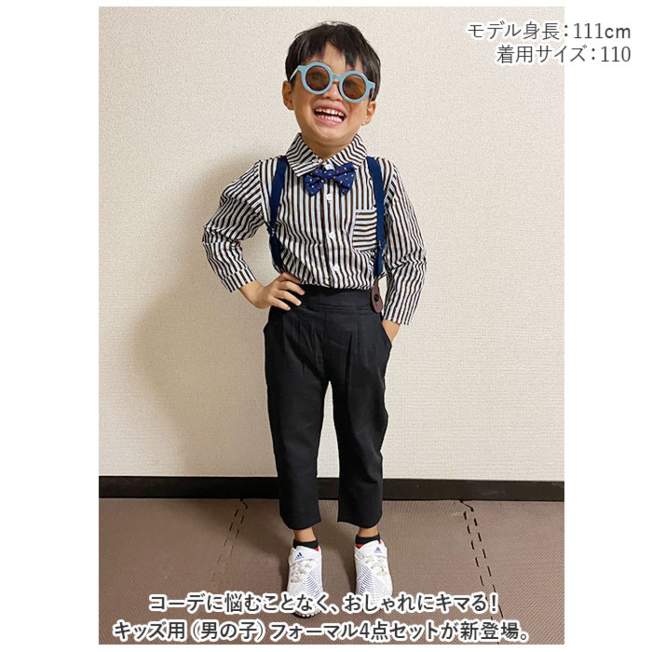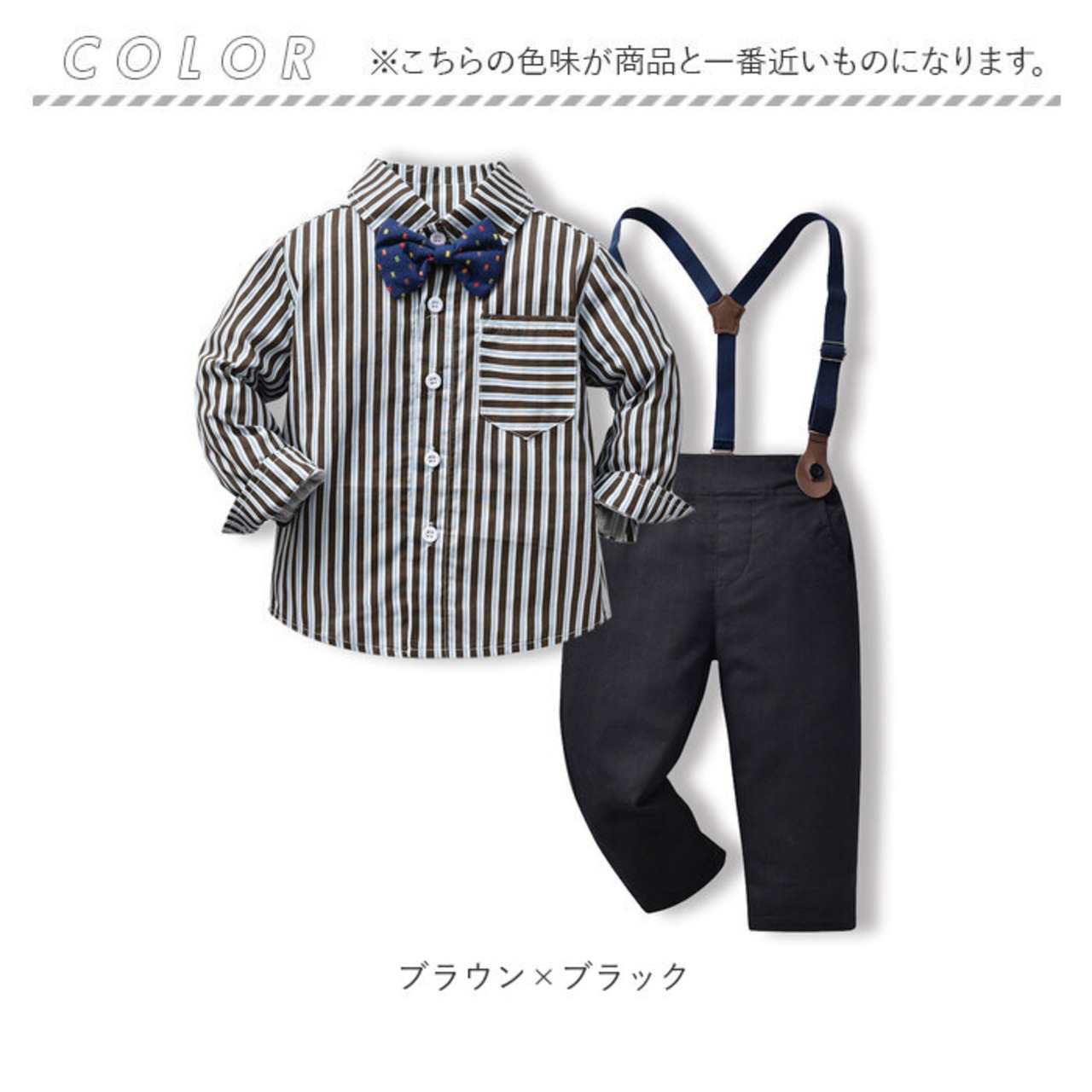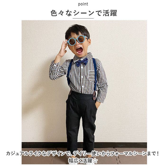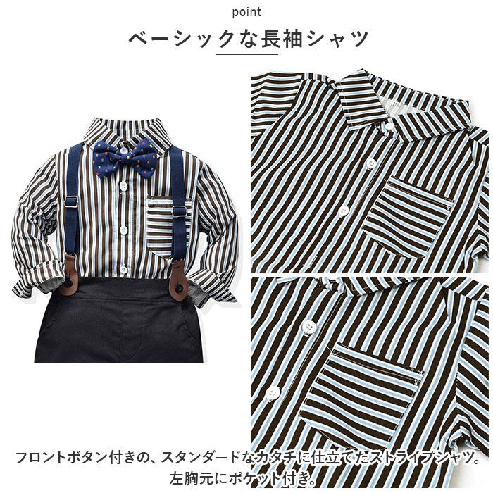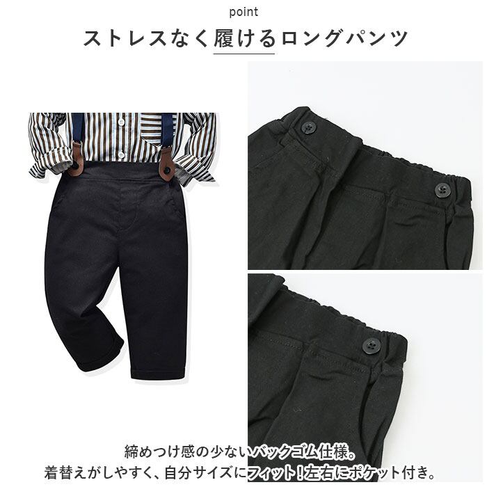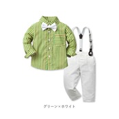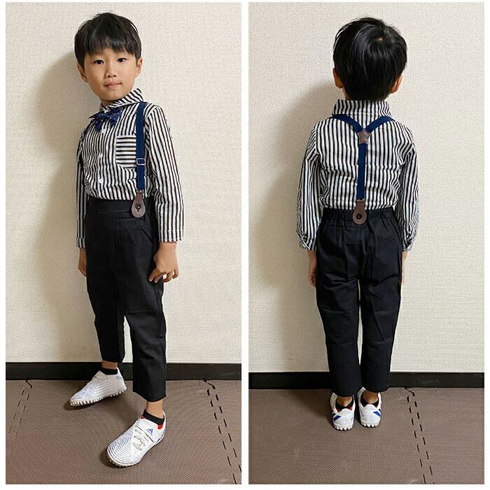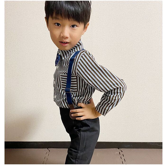 ・長袖シャツ、ロングパンツ、蝶ネクタイ、サスペンダーの4点セット。大人顔負けのスタイリングが完成☆