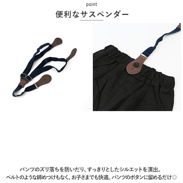 ・パンツのズリ落ちを防いだり、すっきりとしたシルエットを演出。ベルトのような締めつけもなく、お子さまでも快適。パンツのボタンに留めるだけ◎