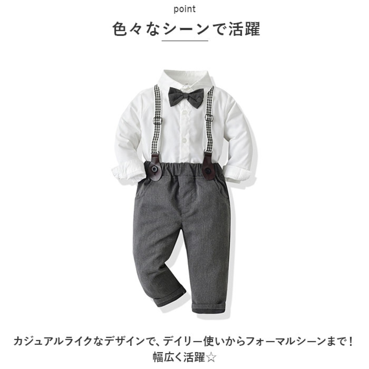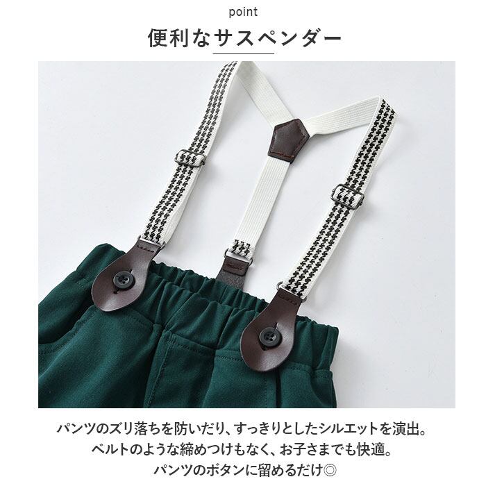 ・長袖シャツ、ロングパンツ、サスペンダーの3点セット。大人顔負けのスタイリングが完成☆