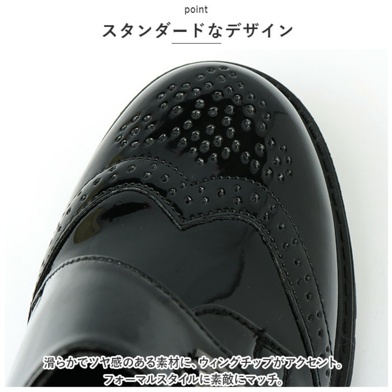 ・滑らかでツヤ感のある素材に、ウィングチップがアクセント。フォーマルスタイルに素敵にマッチ。