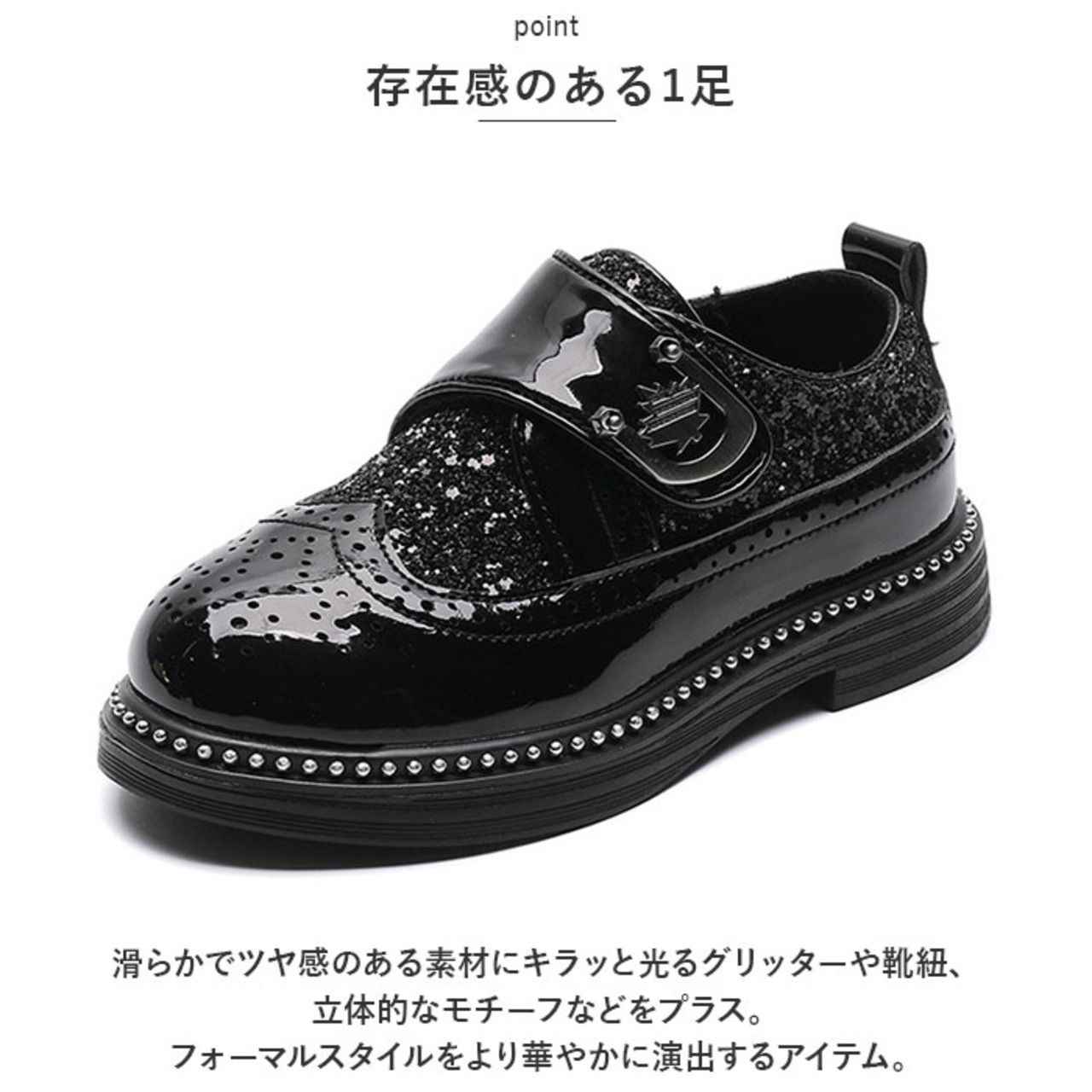 ・滑らかでツヤ感のある素材にキラッと光るグリッターや靴紐、立体的なモチーフなどをプラス。フォーマルスタイルをより華やかに演出するアイテム。