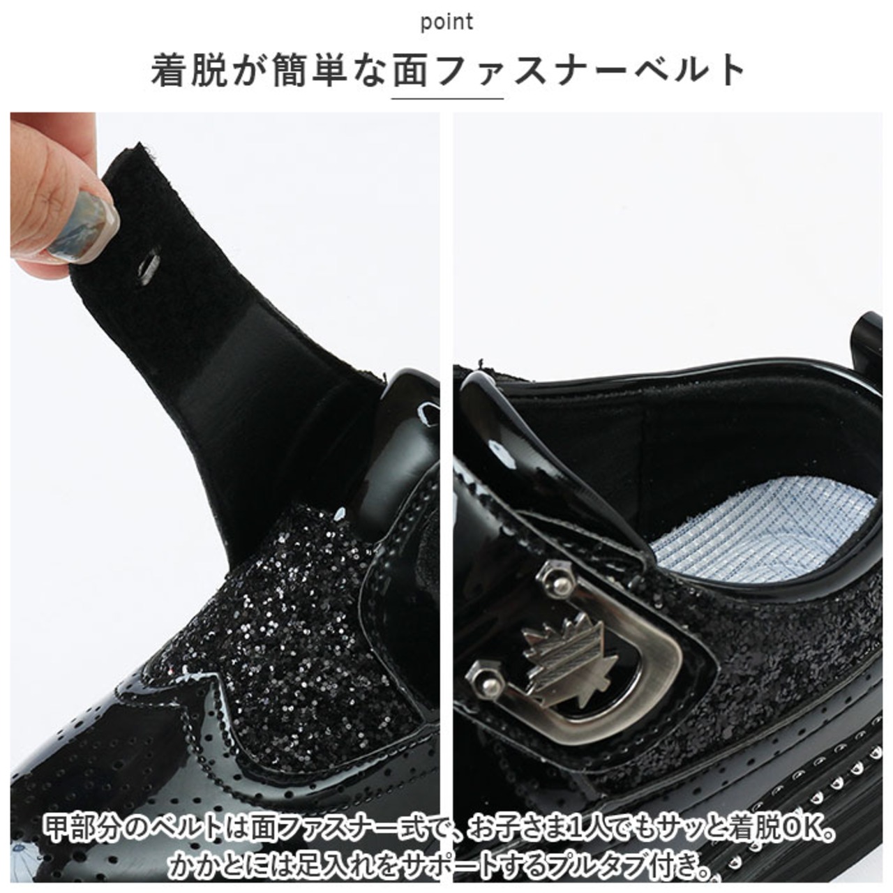 ・甲部分のベルトは面ファスナー式で、お子さま1人でもサッと着脱OK。かかとには足入れをサポートするプルタブ付き。