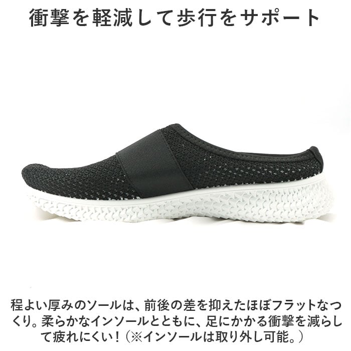 ・程よい厚みのソールは、前後の差を抑えたほぼフラットなつくり。柔らかなインソールとともに、足にかかる衝撃を減らして疲れにくい!(※インソールは取り外し可能。)