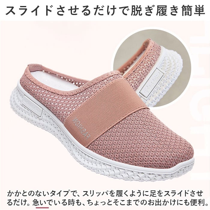 ・かかとのないタイプで、スリッパを履くように足をスライドさせるだけ。急いでいる時も、ちょっとそこまでのお出かけにも便利。