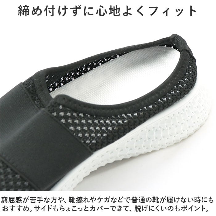 ・窮屈感が苦手な方や、靴擦れやケガなどで普通の靴が履けない時にもおすすめ。サイドもちょこっとカバーできて、脱げにくいのもポイント。