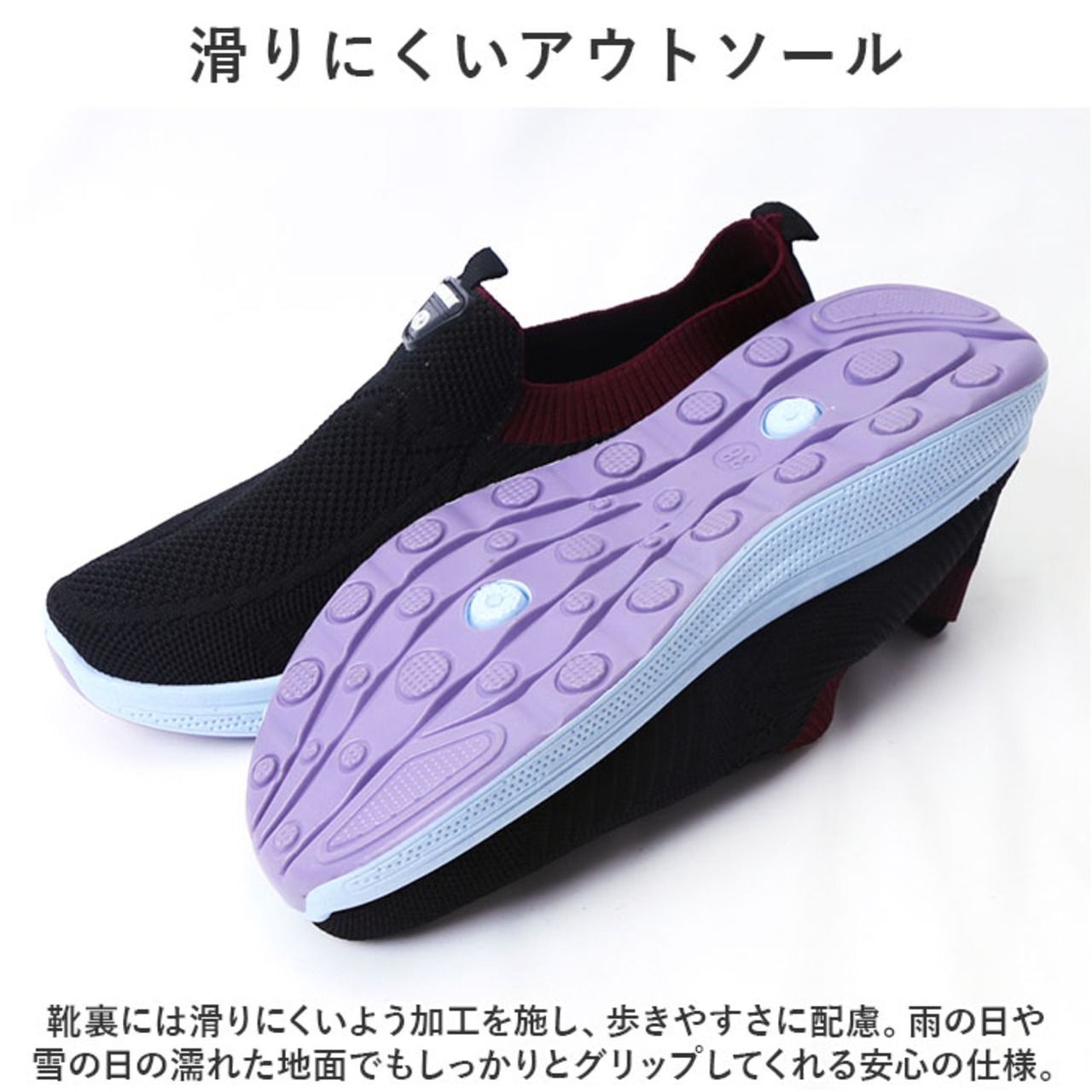 ・靴裏には滑りにくいよう加工を施し、歩きやすさに配慮。雨の日や雪の日の濡れた地面でもしっかりとグリップしてくれる安心の仕様。