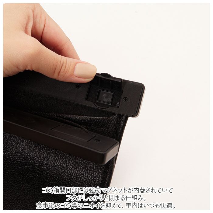 ・ゴミ箱開口部には強力マグネットが内蔵されていて、フタがしっかりと締まる仕組み。食事後のゴミ等のニオイを抑えて、車内はいつも快適。