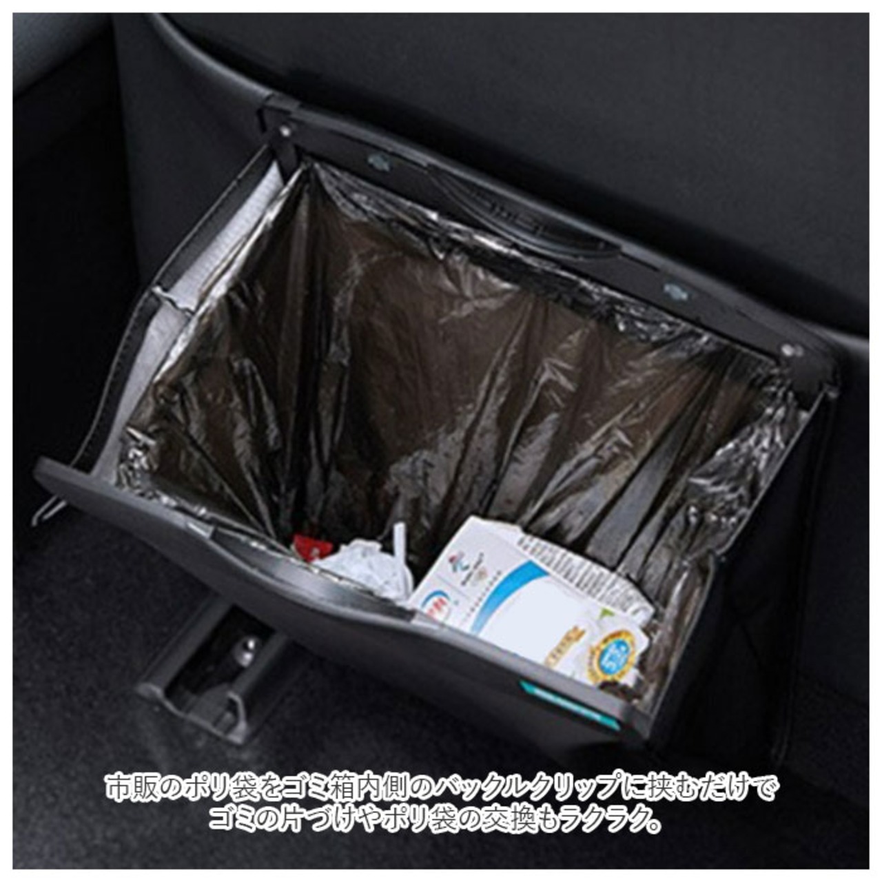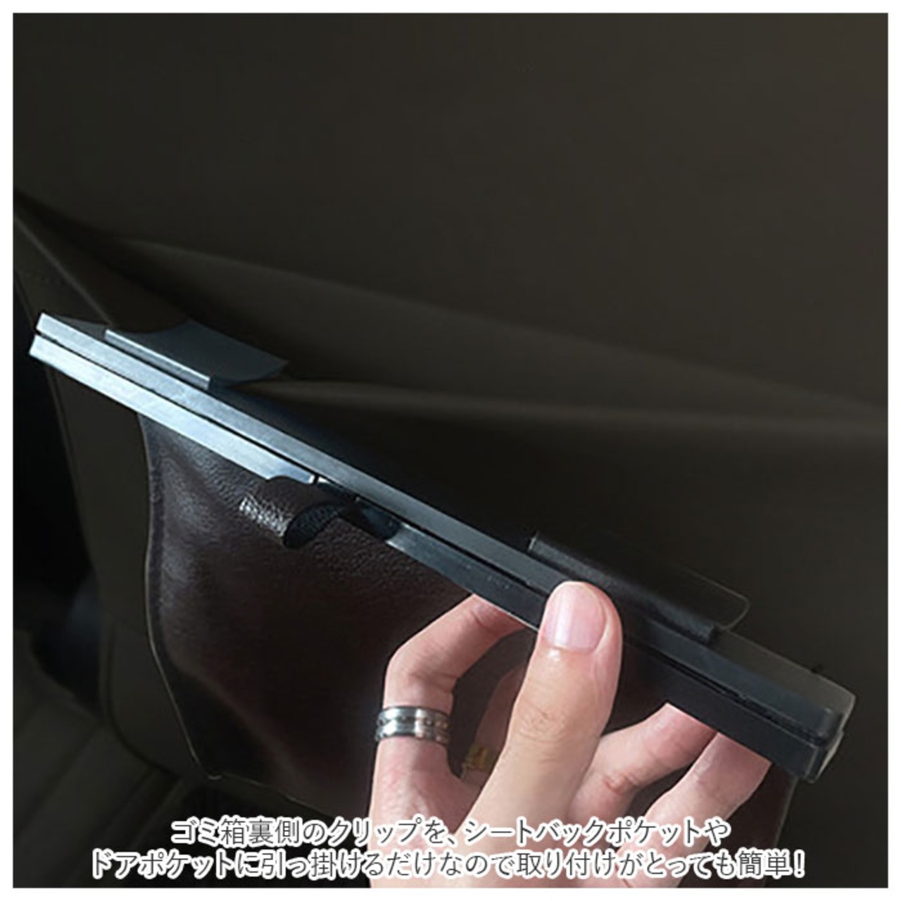 ・ゴミ箱裏側のクリップを、シートバックポケットやドアポケットに引っ掛けるだけなので取り付けがとっても簡単!