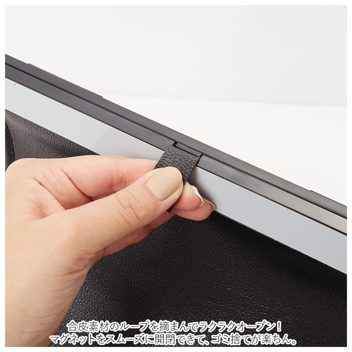 ・合皮素材のループを摘まんでラクラクオープン!マグネットをスムーズに開閉できて、ゴミ捨てが楽ちん。