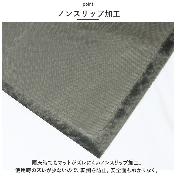 ・雨天時でもマットがズレにくいノンスリップ加工。使用時のズレが少ないので、転倒を防止。安全面もぬかりなく。