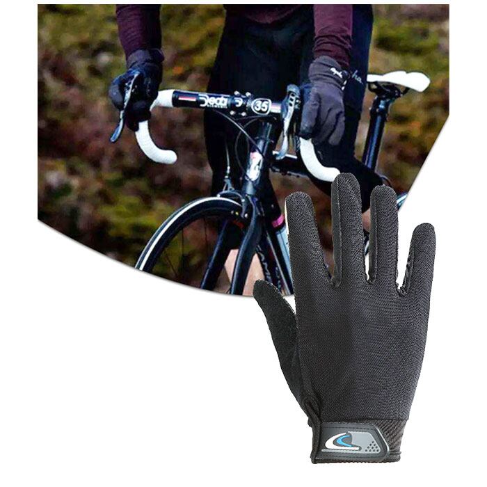 ・グローブの生地は通気性のよい薄手のメッシュ生地を採用。親指部分は汗を吸収するタオル生地で仕上げ、スリーシーズン快適な付け心地。