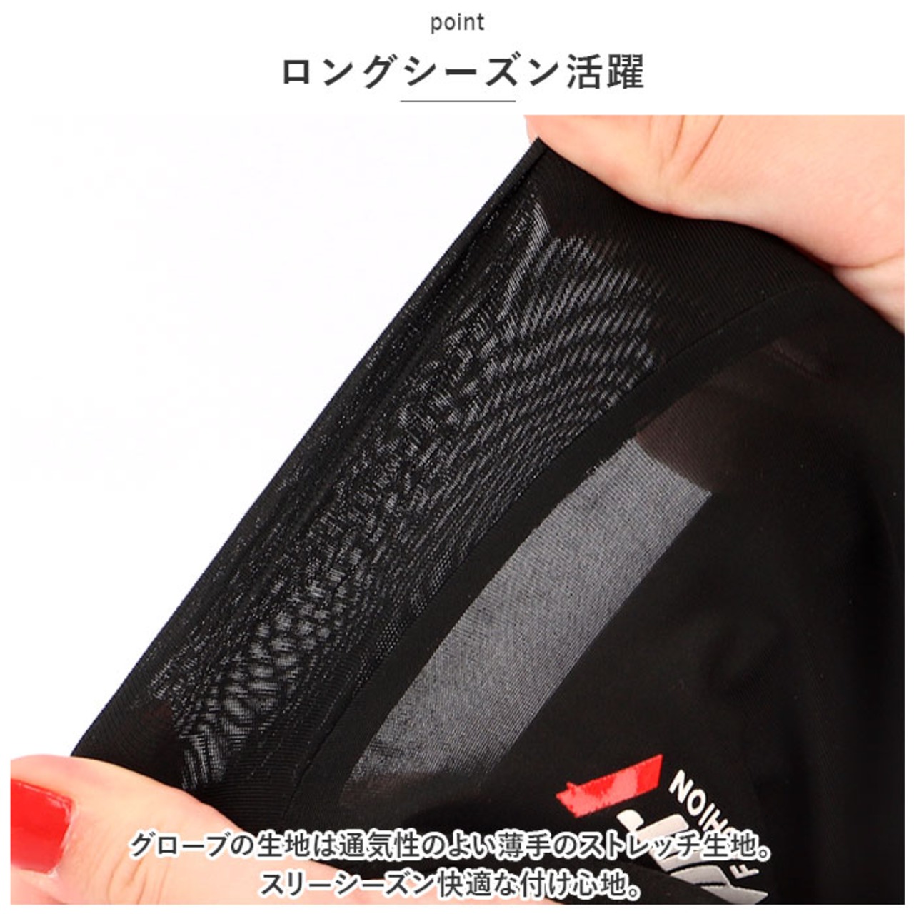 ・グローブの生地は通気性のよい薄手のストレッチ生地。スリーシーズン快適な付け心地。