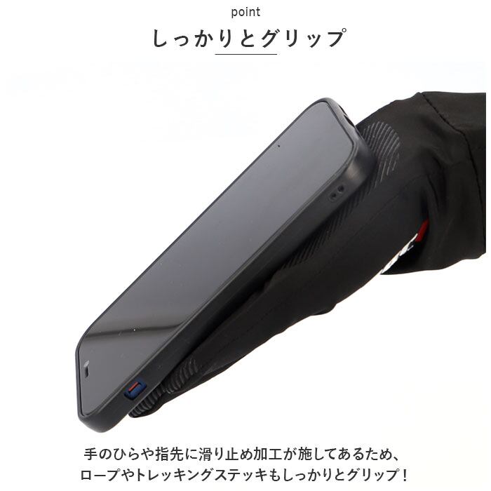 ・手のひらや指先に滑り止め加工が施してあるため、ロープやトレッキングステッキもしっかりとグリップ!