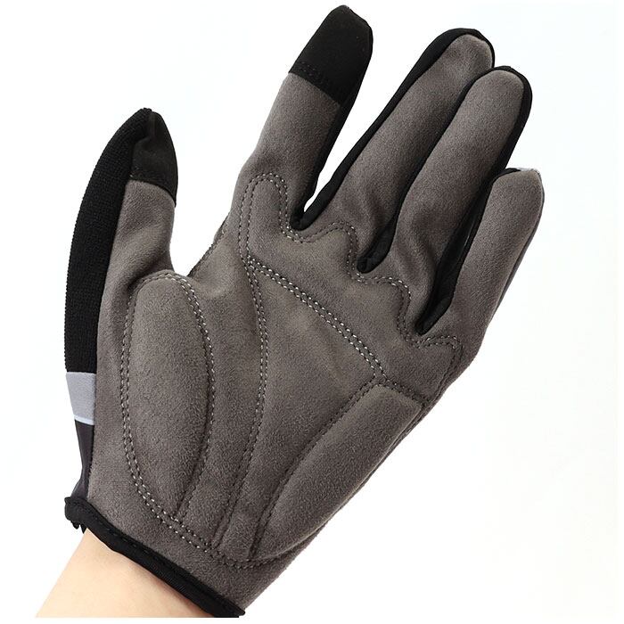 ・グローブの生地は通気性と伸縮性が良い生地を採用。親指部分は汗を吸収しやすい生地で仕上げ、スリーシーズン快適な付け心地。