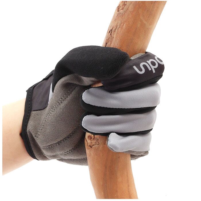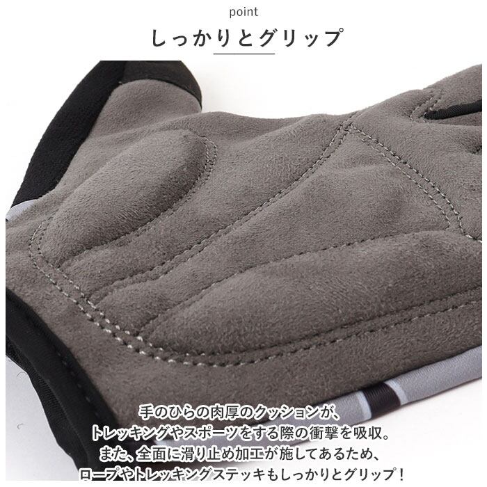 ・手のひらの肉厚のクッションが、トレッキングやスポーツをする際の衝撃を吸収。マメやケガの予防に。また、全面に滑り止め加工が施してあるため、ロープやトレッキングステッキもしっかりとグリップ!