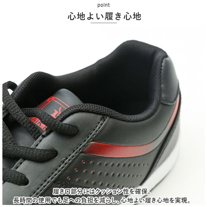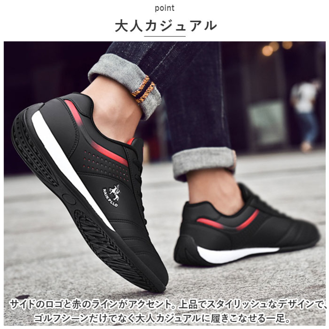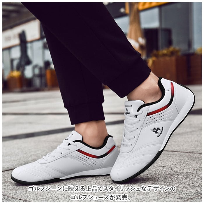 ・サイドのロゴと赤のラインがアクセント。上品でスタイリッシュなデザインで、ゴルフシーンだけでなく大人カジュアルに履きこなせる一足。