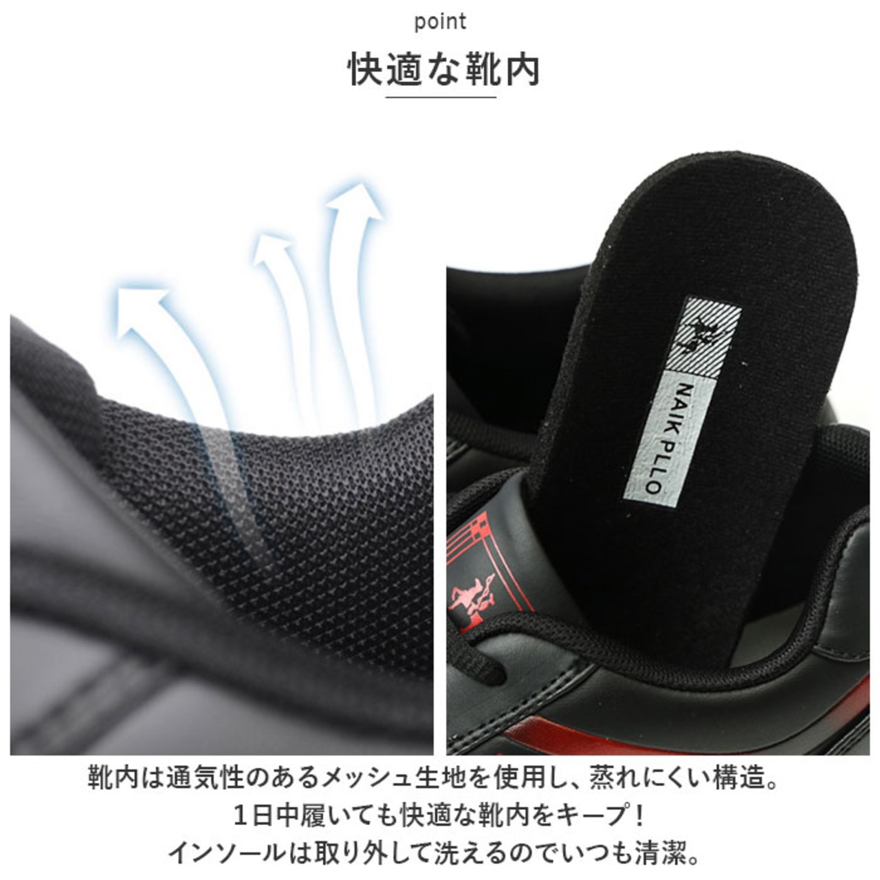 ・靴内は通気性のあるメッシュ生地を使用し、蒸れにくい構造。1日中履いても快適な靴内をキープ!インソールは取り外して洗えるのでいつも清潔。