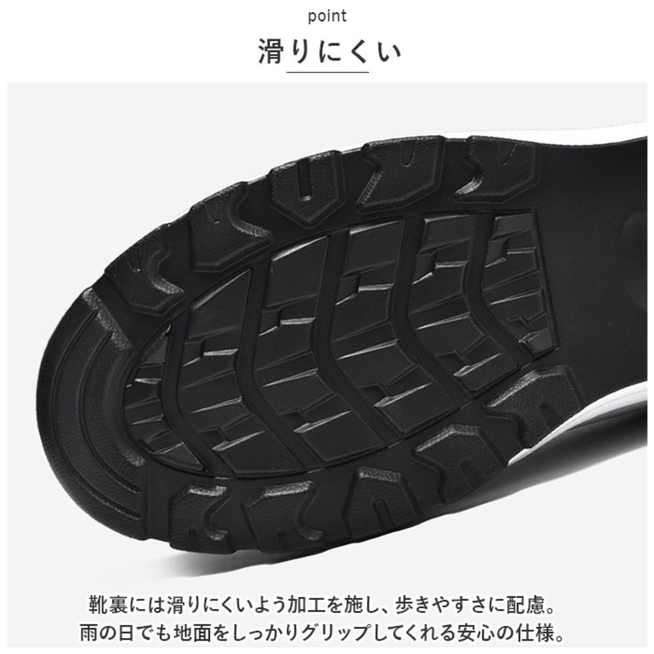・靴裏には滑りにくいよう加工を施し、歩きやすさに配慮。雨の日でも地面をしっかりグリップしてくれる安心の仕様。
