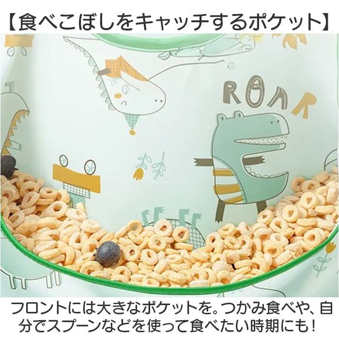 ・フロントには大きなポケットを。つかみ食べや、自分でスプーンなどを使って食べたい時期にも!