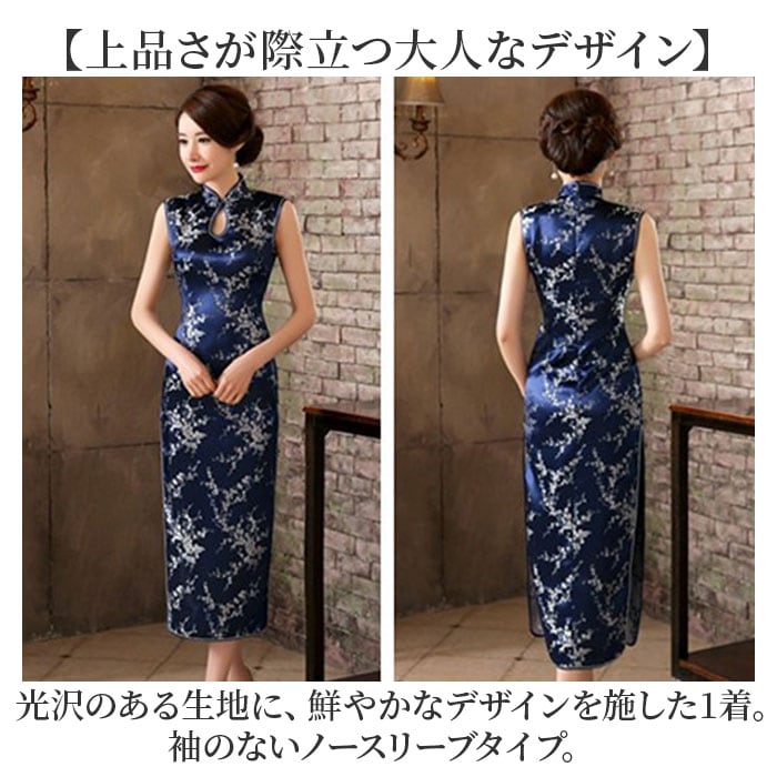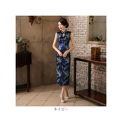 ・光沢のある生地に、鮮やかなデザインを施した1着。袖のないノースリーブタイプ。