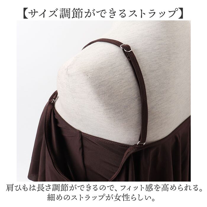 ・肩ひもは長さ調節ができるので、フィット感を高められる。細めのストラップが女性らしい。
