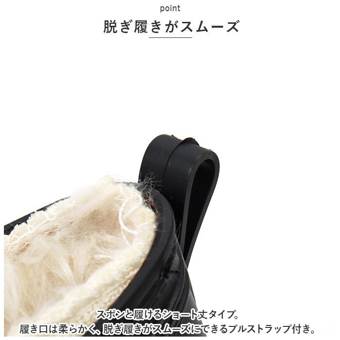 ・スポンと履けるショート丈タイプ。履き口は柔らかく、脱ぎ履きがスムーズにできるプルストラップ付き。
