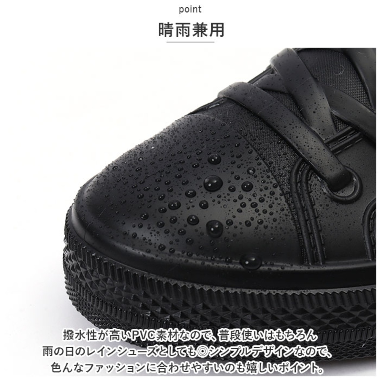 ・撥水性が高いPVC素材なので、普段使いはもちろん雨の日のレインシューズとしても◎シンプルデザインなので、色んなファッションに合わせやすいのも嬉しいポイント。